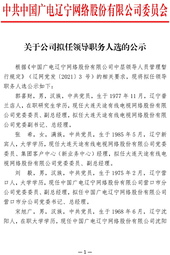 中國廣電遼寧網絡股份有限公司(簡稱中國廣電遼寧公司)前身為成立于2010年2月的北方聯合廣播電視網絡股份有限公司,系中央國有文化企業——中國廣電網絡股份有限公司省級子公司、遼寧省國有文化高新技術企業,是按照現代企業制度打造的集網絡建設、傳輸、運營及多功能開發與應用為一體綜合網絡運營商。